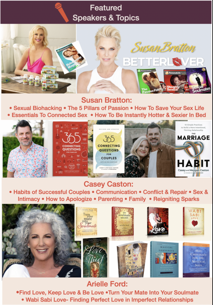 We’re thrilled to welcome Susan Bratton, Intimacy Expert and bestselling author of 44 books and programs. She’ll reveal how to keep intimacy alive, spark erotic connection, and expand your capacity for both giving and receiving pleasure — at any age or stage of life.
